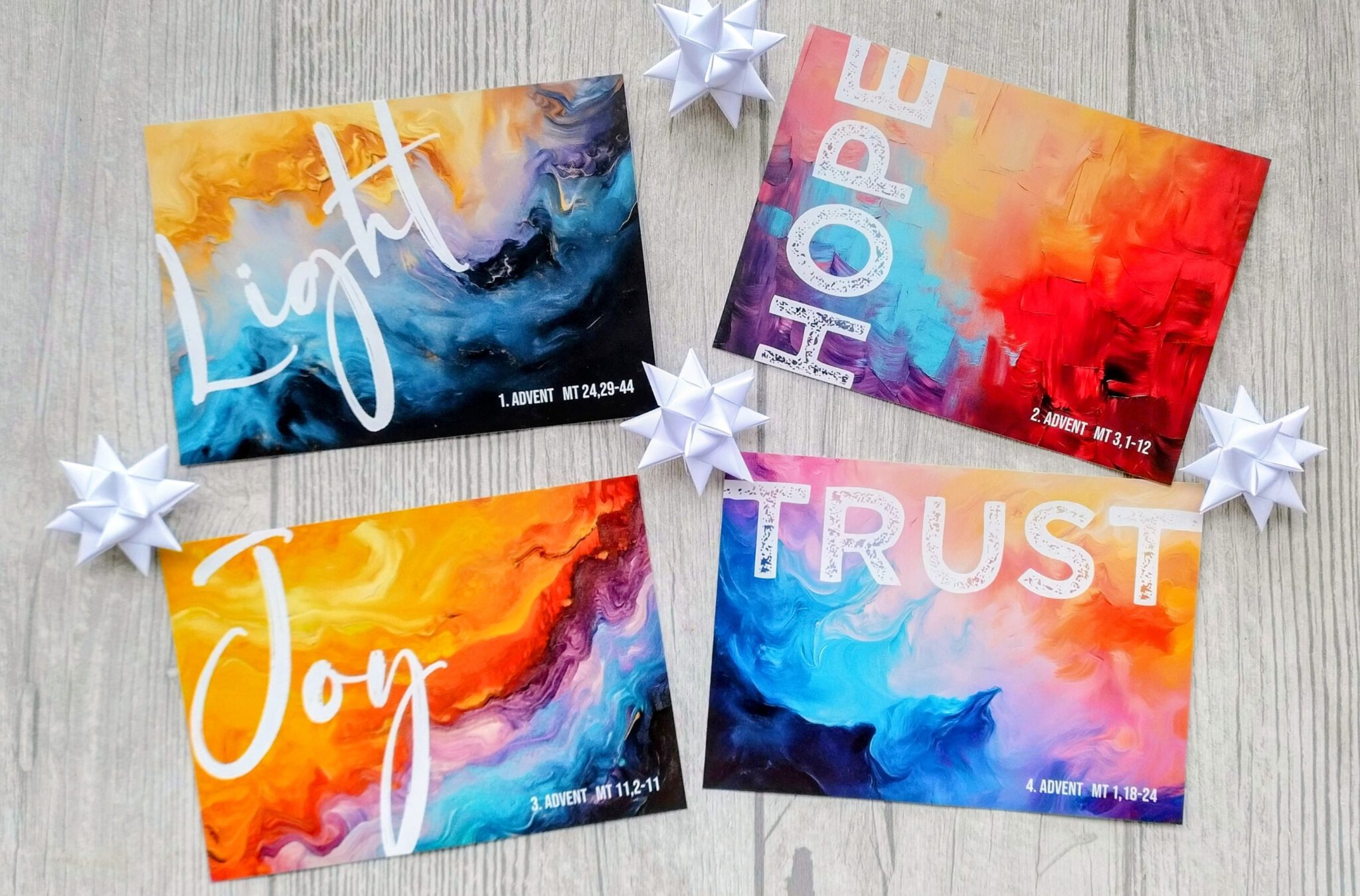 Advent heißt: Gott kommt in unsere Welt – nicht erst, wenn alles sortiert ist, sondern mitten in Fragen, politische und private Unsicherheiten, in Aufbruch und Freude. Die vier Karten der Adventsaktion des BDKJ Hamburg greifen in diesem Jahr diese Bewegung auf. Kräftige Farbflächen, die auf digitalisierten Ölmalerei-Strukturen basieren: Sichtbare Pinselspuren, echte Kanten und fließende Kontraste statt glatter Perfektion. Beruhigende Indigo- und Petroltöne erzählen vom Dunkel unserer Zeit, Rot- und Orange von der Dringlichkeit des Aufbruchs, kühles Türkis-Violett vom Fragen und Klären, warmes Goldgelb von Gottes Licht, das schon da ist, bevor alles fertig ist. Die vier Schlagworte führen durch die vier Evangelien der Adventssonntage: „LIGHT“ – Licht bricht ein, „HOPE“ – Hoffnung wagt Veränderung, „JOY“ – Freude steckt an und „TRUST“ – Vertrauen trägt Beziehung. Die adventliche Perspektive auf Gottes Menschwerdung an Weihnachten ist persönlicher Zuspruch und Einladung zur Menschlichkeit gleichermaßen. Und deshalb fragen die Karten am Ende immer: Was kannst du weitergeben? Wer braucht dich gerade?