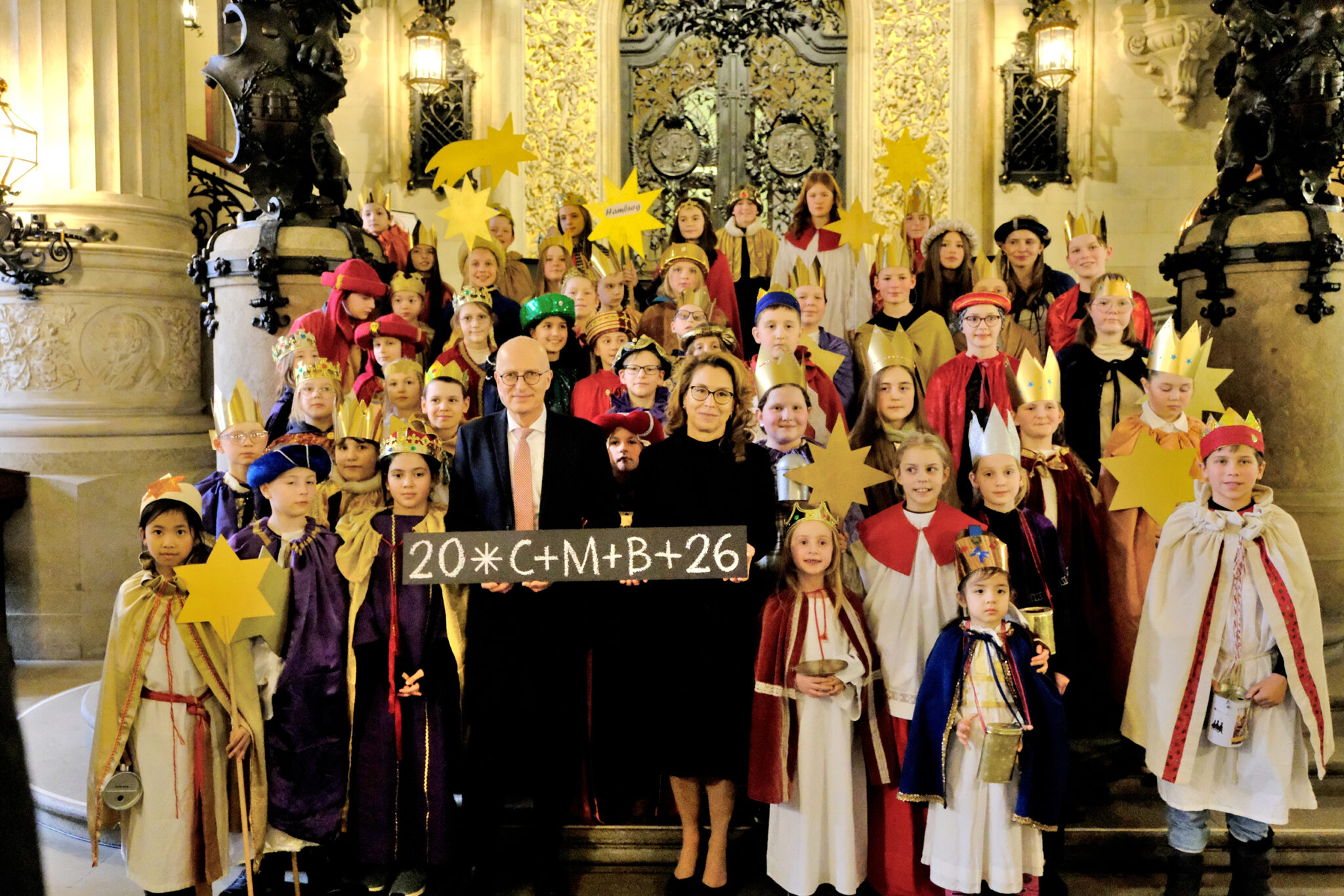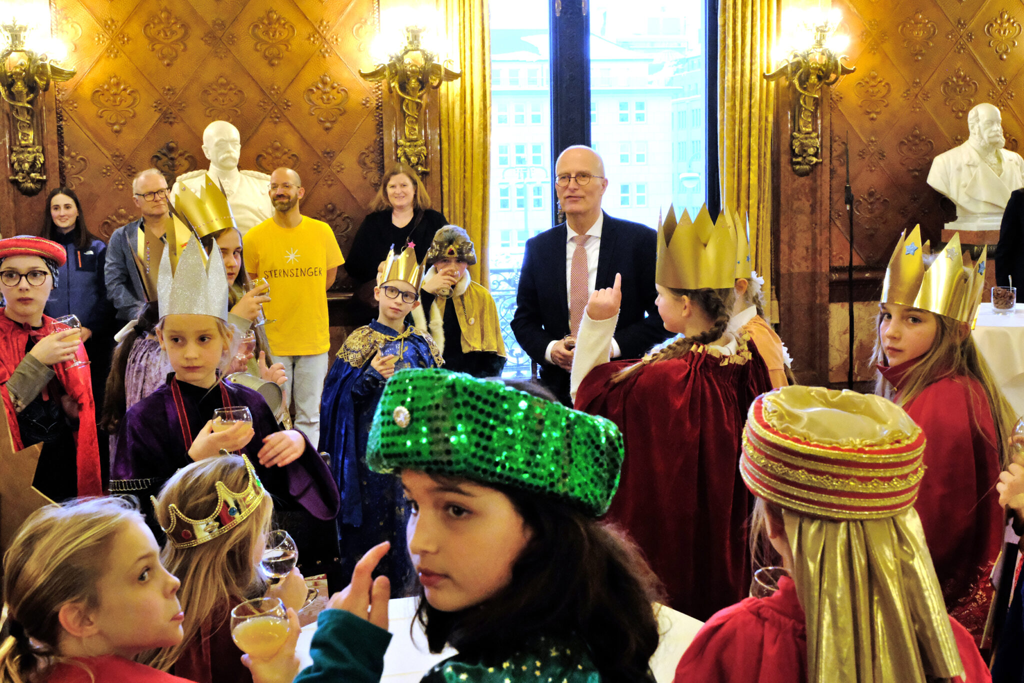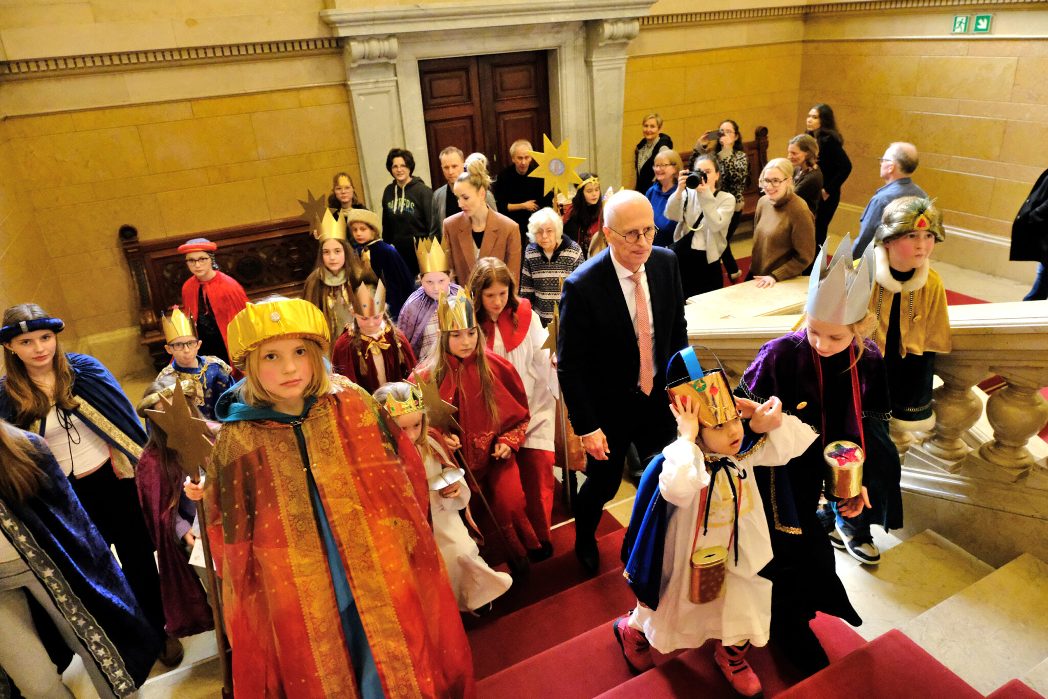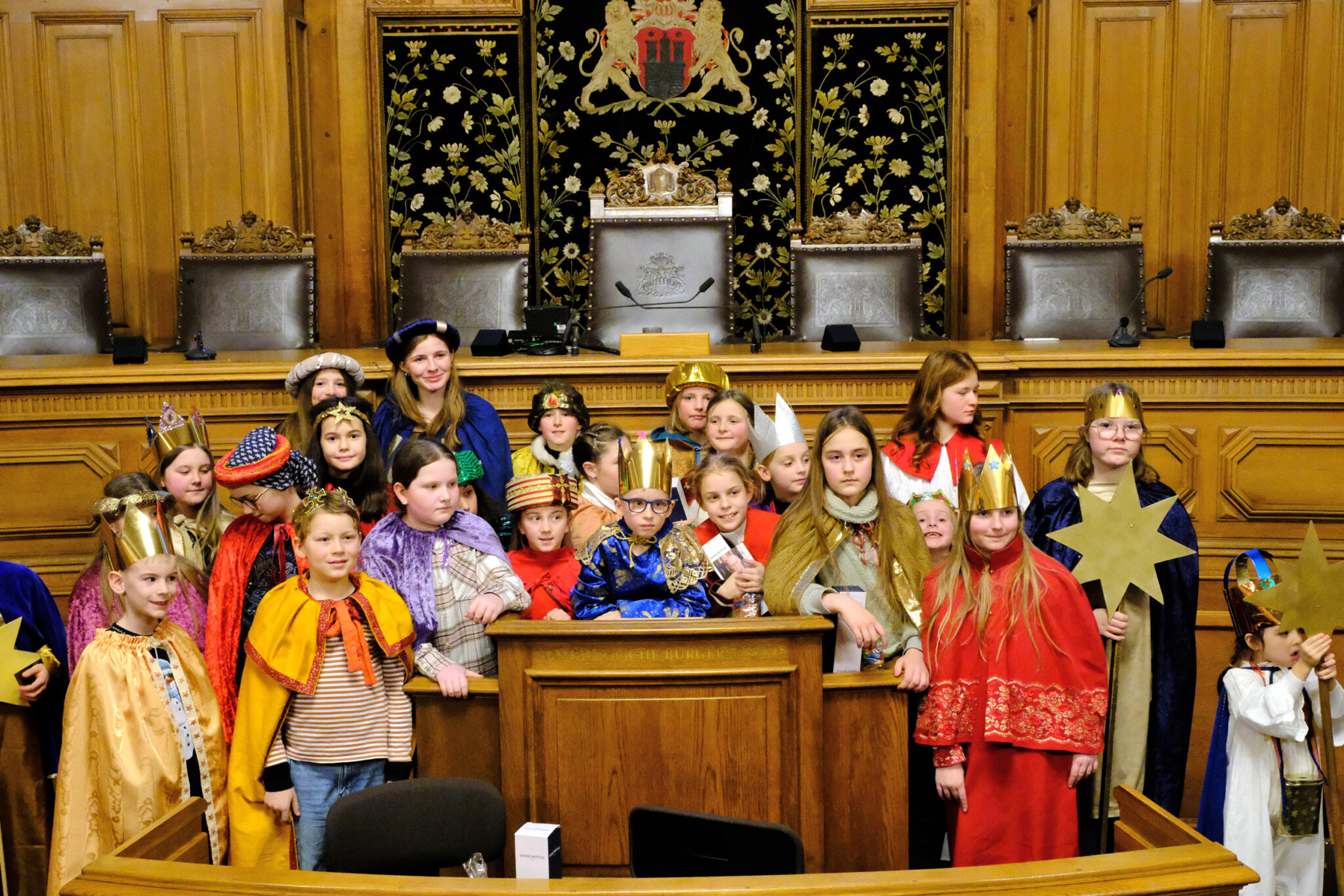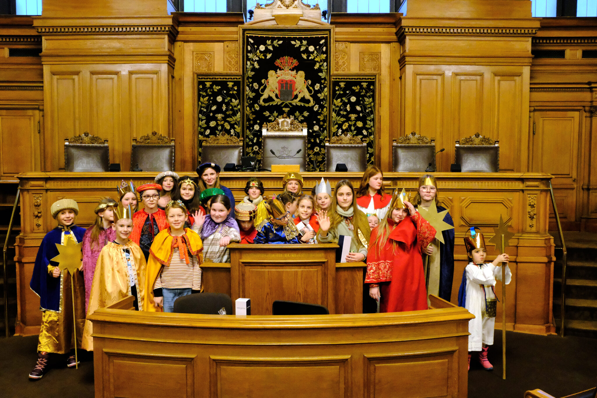 Am 6. Januar besuchten rund 50 Sternsinger*innen das Hamburger Rathaus, brachten den Segen und machten auf die Rechte von Kindern weltweit aufmerksam. Nach dem Singen wurden sie von Bürgermeister Peter Tschentscher und Bürgerschaftspräsidentin Carola Veit durch das Rathaus geführt. Die Kinder durften auf den Stühlen der Abgeordneten Platz nehmen, Fragen stellen, spannende Geschichten hören und vieles ausprobieren. In Hamurg wurden außerdem vier Behörden und das Bundesamt für Seeschifffahrt durch die Sternsinger*innen besucht.
